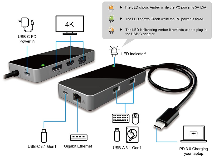 The VSD53B0 is a portable design between the office and home. A mobile office can be set up in seconds with a single USB-C connection. It supports the multi-video output (VGA/DP/HDMI) and also has an Ethernet LAN port. In addition, the VSD53B0 mini dock has 2 USB3.1 Type-A connectors and 1 USB 3.1 Type-C connector.